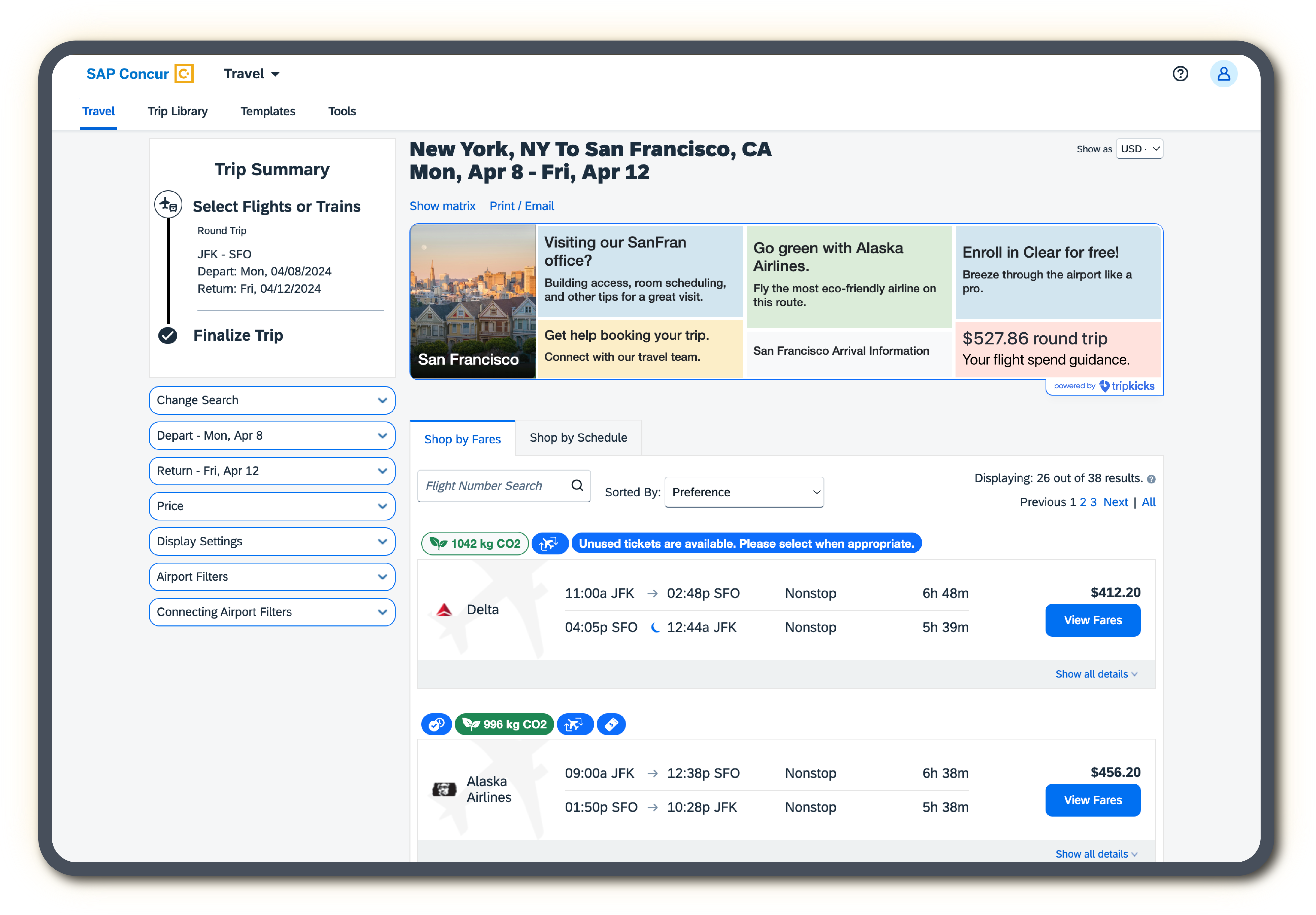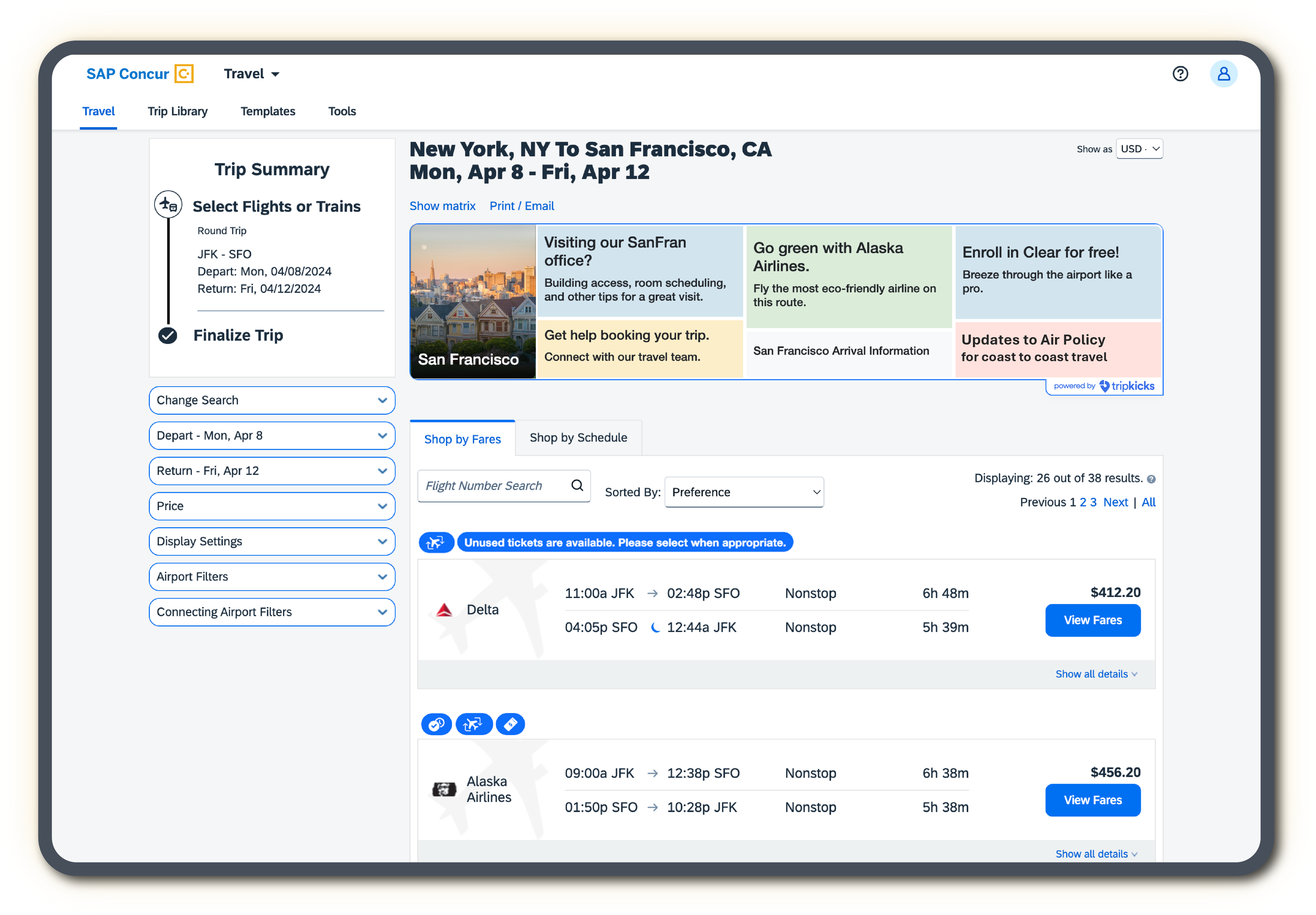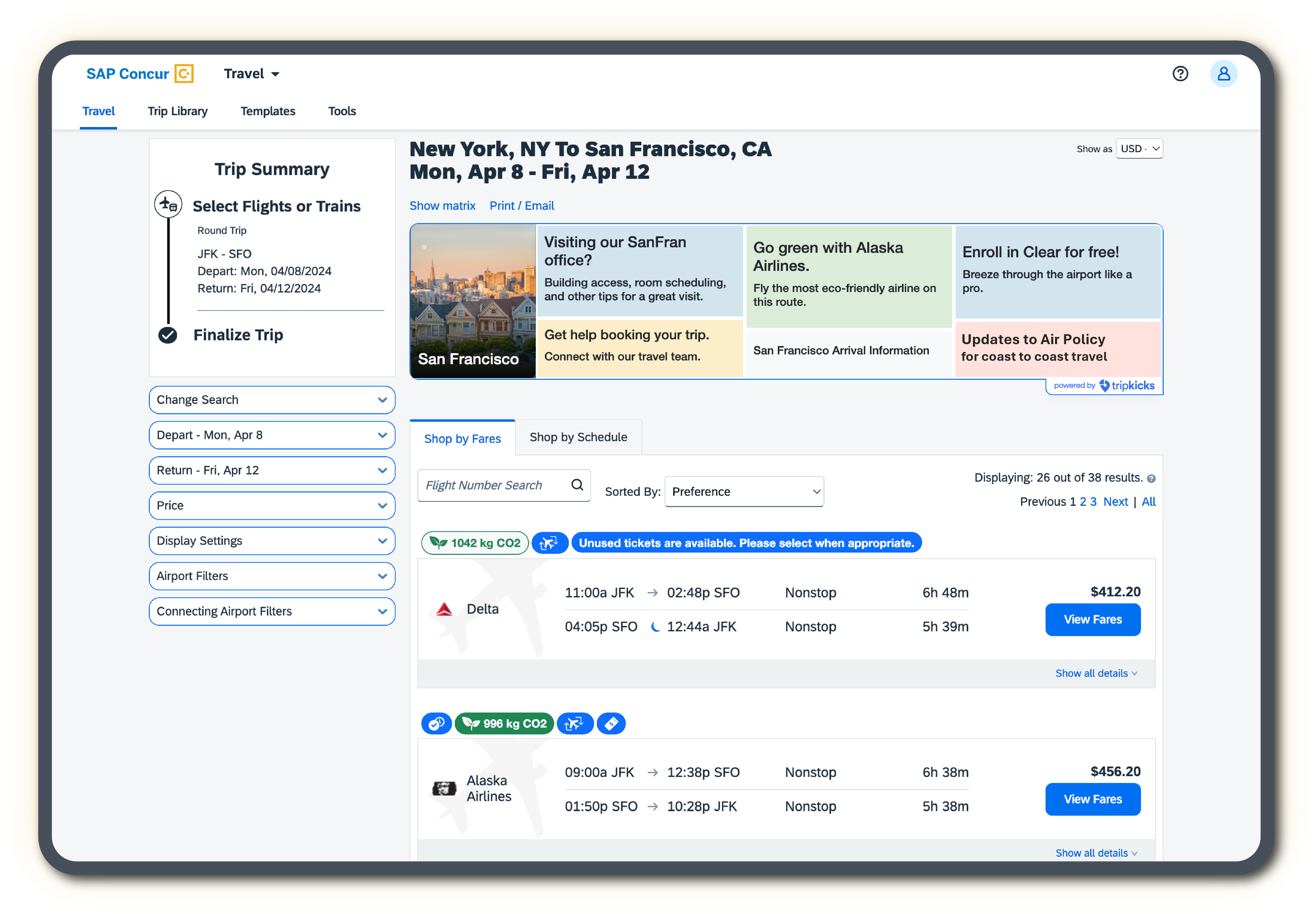 - Trip Insights Banner - Travel insights appear at the top of your search results, displaying the most important information and insights for your trip (e.g., visa requirements, safety bulletins, travel alerts, and destination information.) Travel tips also appear, explaining recommended choices and more sustainable options. (e.g., Take the train instead of flying for this trip)